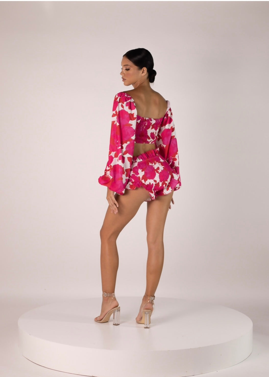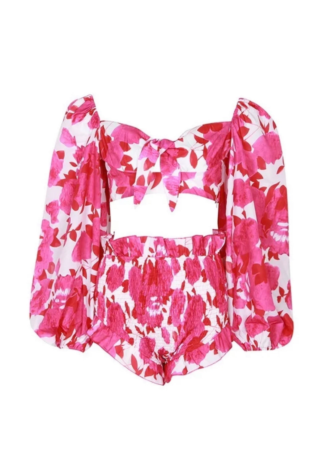 Conjunto de top manga abullonada , bottom con Olán y a la cintura , print flores