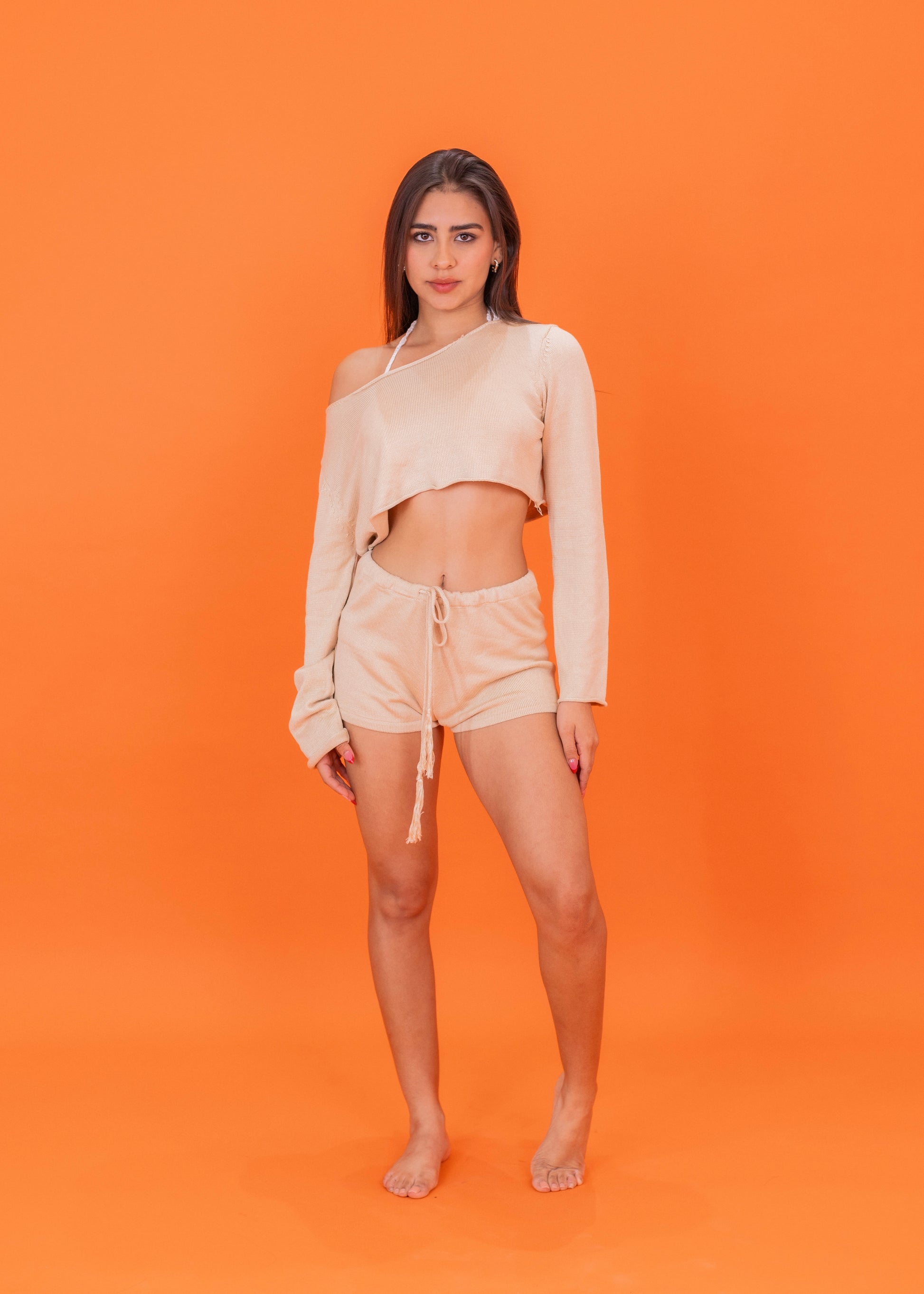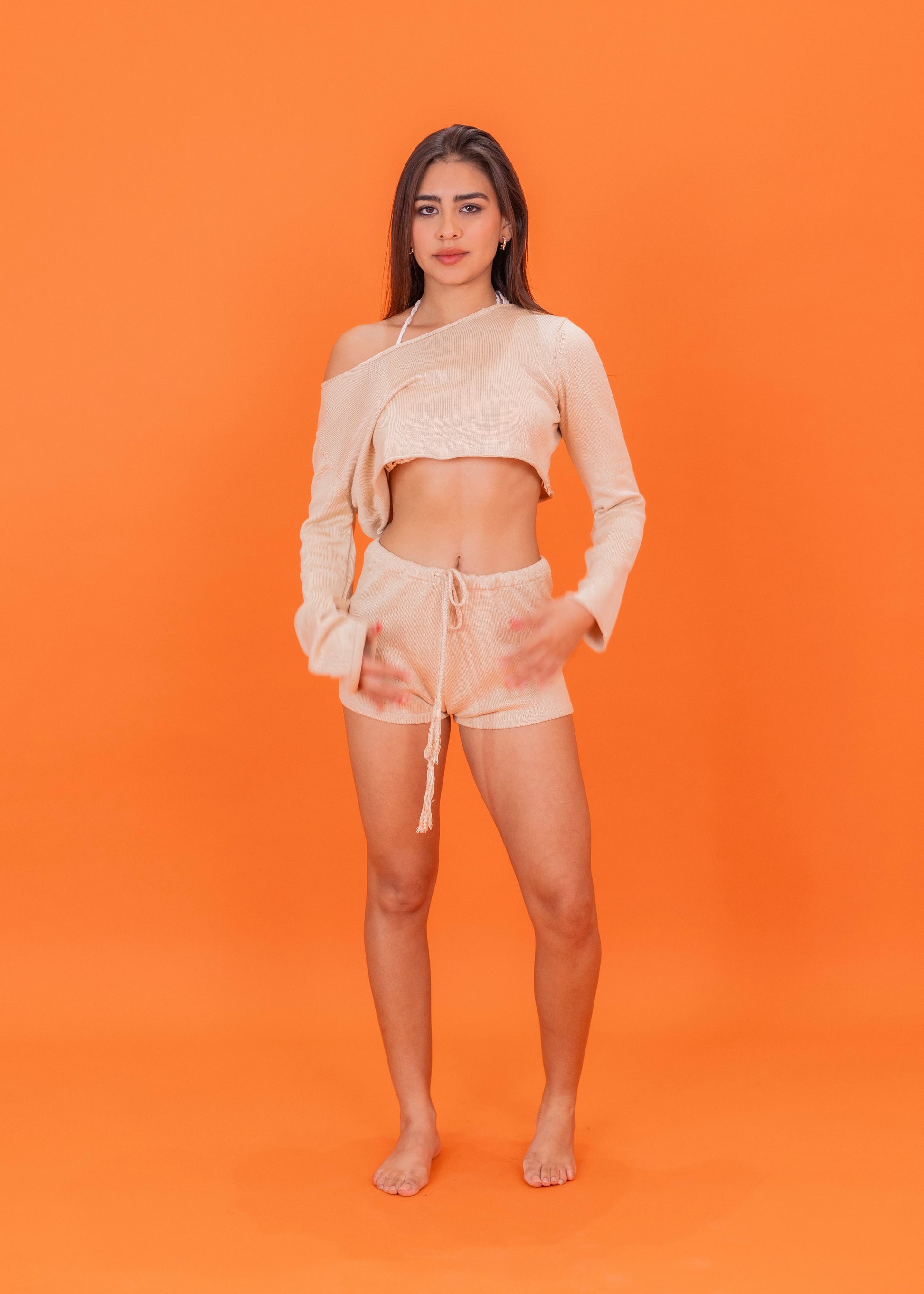Conjunto de top crop de manga larga y short de pretina ajustable