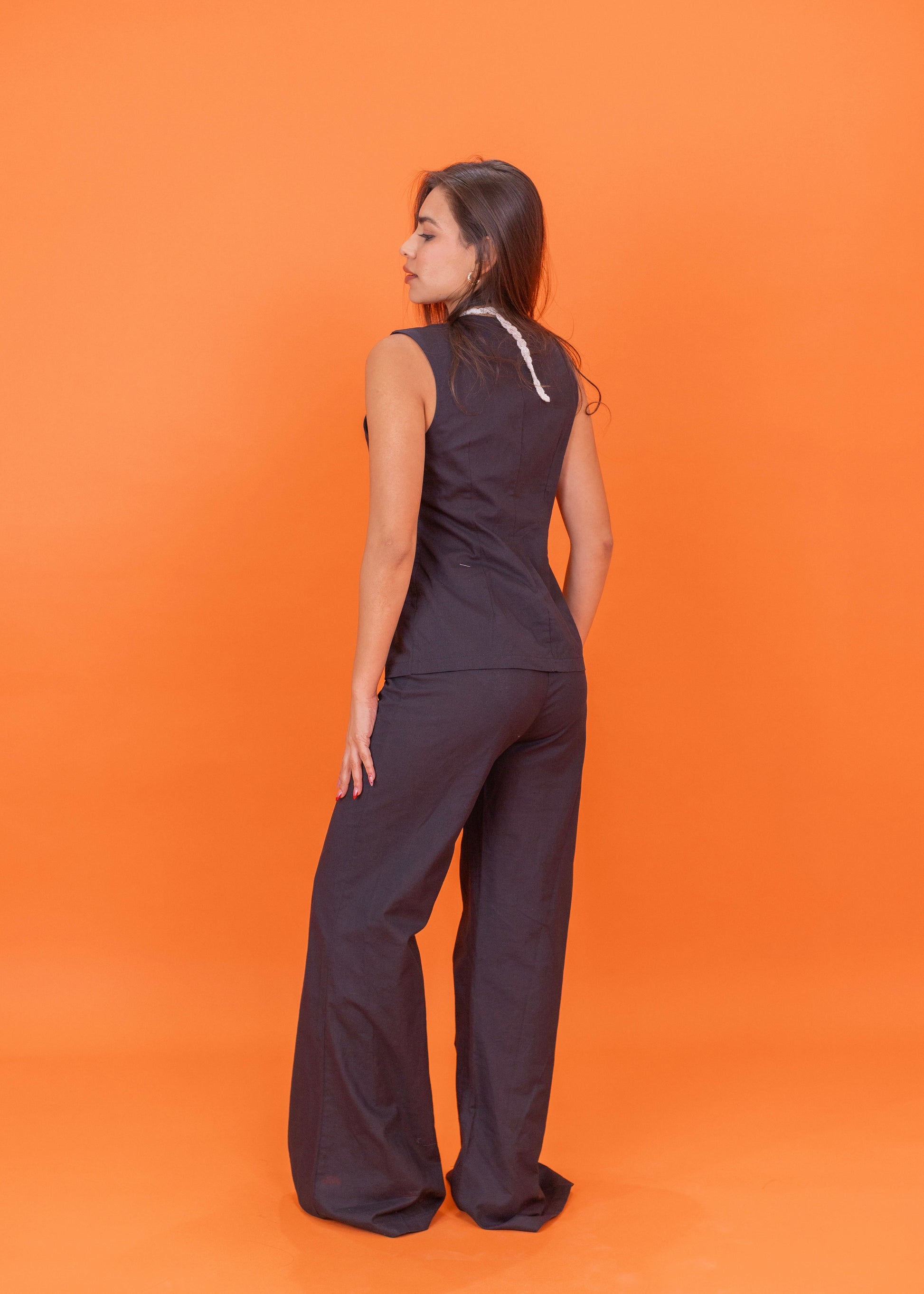 Conjunto de top tank y botones y pantalón acampanado de vestir negro