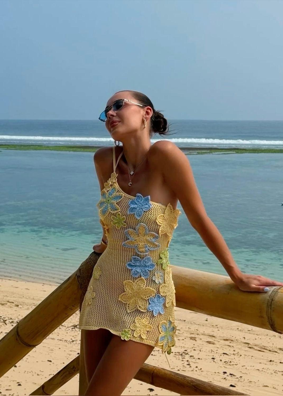 Vestido corto de tejido con flores azules amarillas, cuello asimétrico